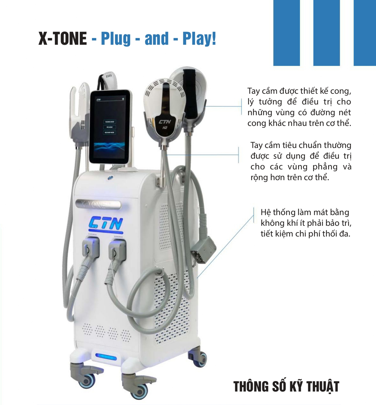 - X-TONE™ là thiết bị hàng đầu trong MMS, nổi bật nhờ khả năng nhắm mục tiêu đúng vào các nhóm cơ cụ thể, khiến thiết bị này đặc biệt phù hợp để làm săn chắc và làm khoẻ cơ. Những cơn co thắt cơ với cường độ cao không chỉ khuyến khích cơ trương lực, làm khoẻ cơ mà còn có khả năng hỗ trợ phá vỡ các tế bào mỡ ở vùng được điều trị.